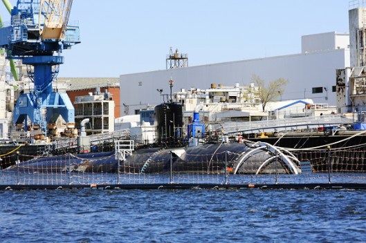 船長提到潛艇時我還找了半天,後來好不容易才看到像黑色水槽,只有不到一半露出海面的潛艇。這種核動力潛艇在海底潛行時,時速可以高達50節(58英里/93公里),幾乎跟汽車開高速公路差不多快。