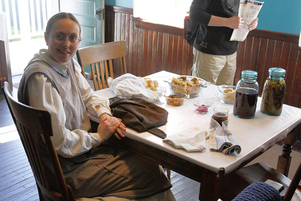 另一棟房屋中有位中年婦女,為我們講解在沒有電冰箱的年代如何保存食物。新英格蘭一個重要的食物來源是魚,保存魚類的方法是把魚對剖,去除頭尾和骨頭,抹上大量食鹽後曬乾。這樣的魚乾可以擺放多年都不會壞。準備料理前,要把魚乾泡水,並經常換水去除鹽分並使魚肉恢復原本的含水量,一兩天之後,才能把魚肉煮熟食用。