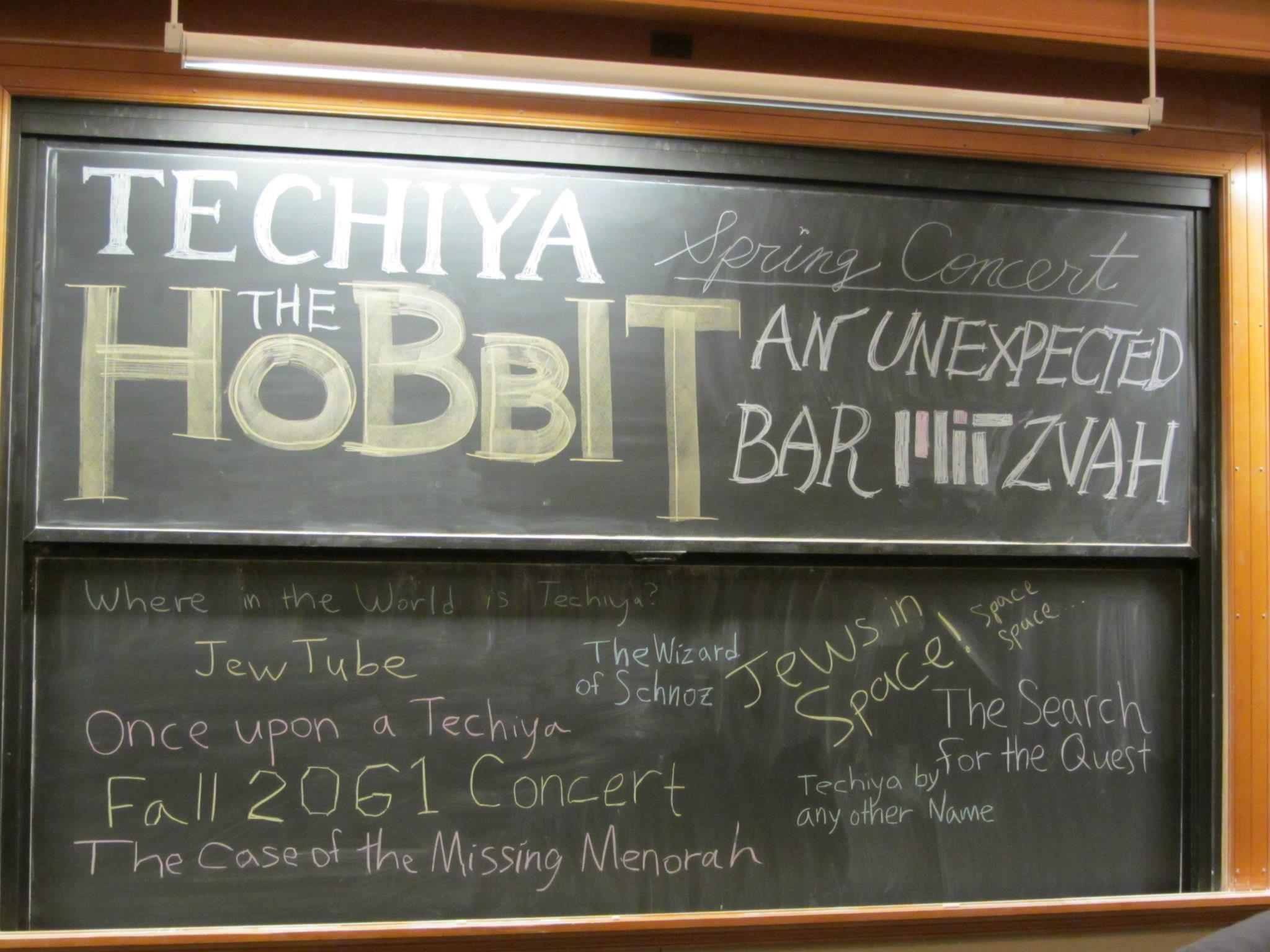 宣傳部在公演當天最後的任務,就是印節目單、摺節目單、佈置表演場地的黑板,以及在走廊上貼暫時性標誌。通常中間上面的一塊黑板,用來寫上團名Techiya以及公演主題,我就直接照海報上的排版了,唯一不同的是寫到一半決定把"Bar Mitzvah"其中的Mit三字改成MIT的學校logo。至於其他黑板就寫上團員名字、與短劇主題相關的場景等等。
