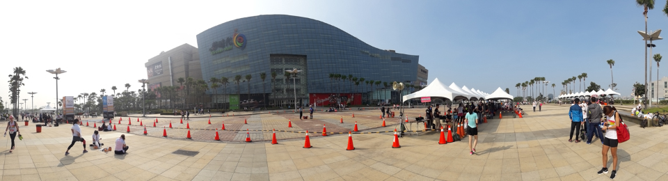 會場小小的,就在時代大道上簡單的幾個帳篷。雖然V-Girls路跑首度舉辦請了不少名人代言宣傳,但大概同一時間有許多賽事分散人數,也有些跑者還在觀望,看起來參加的人數似乎不多。我其實滿喜歡這種小型的路跑,不會人擠人,一來容易跑出自己的速度,二來動線會比較順暢,不必大排長龍領東西,三來路線若有美景,也比較能夠一個人放空靜靜欣賞。